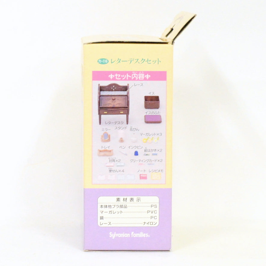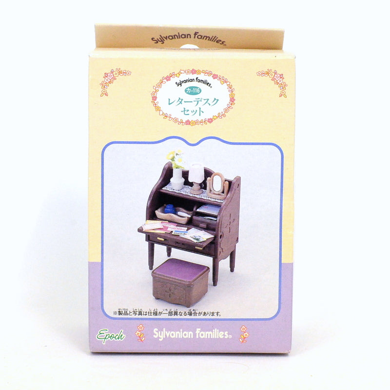 مجموعة مكتب الرسائل لعائلة سيلفانيان Sylvanian Families LETTER DESK SET من كاليكو كريترز Calico Critters رقم KA-116 من Epoch Japan. مجموعة مكتب وكرسي مطلية بلون بني داكن. تشمل المكتب، الكرسي، المرآة، مصباح المكتب، المزهرية، الزهور، الصينية، القلم، الحبر، البطاقة البريدية، الظرف، ورق الرسائل، بطاقة التهنئة، الدفتر، والمذكرة.