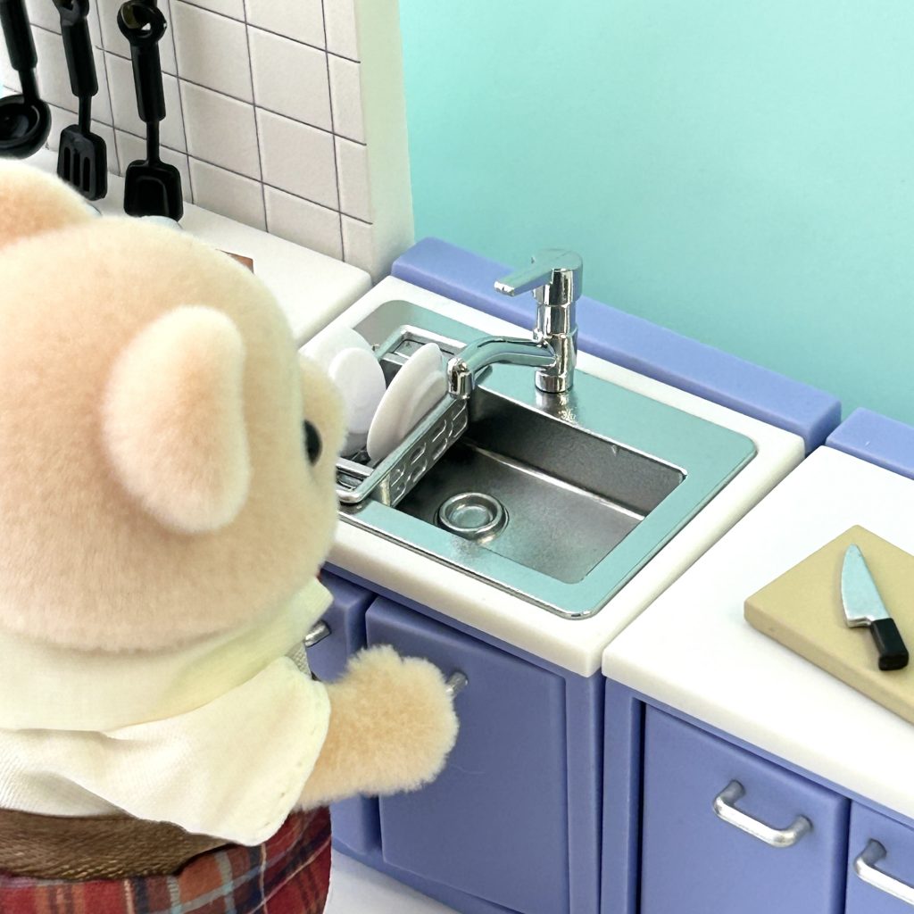 تتضمن هذه المجموعة حوض غسيل، مصفاة أطباق، ثلاث صحون، العداد أ، لوح تقطيع، سكين، العداد ب، رف توابل، ثلاث علب، موقد وفرن، صينية خبز، وعاء برتقالي، جدار، مجموعة أدوات مطبخ، مجموعة توابل، ووعاء أزرق. الدمية غير مشمولة.