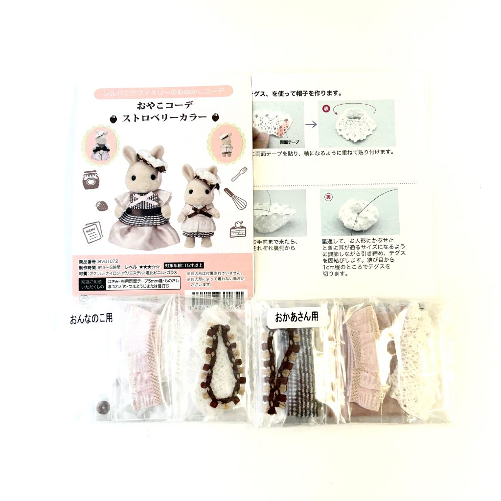 هذا منتج تعاوني بين Craft Tokai و Sylvanian Families. هو مجموعة لصنع أزياء بلون الفراولة للدمى الأم والفتاة. الدمى غير مشمولة. الأدوات والمواد اللاصقة الإضافية مطلوبة بشكل منفصل.