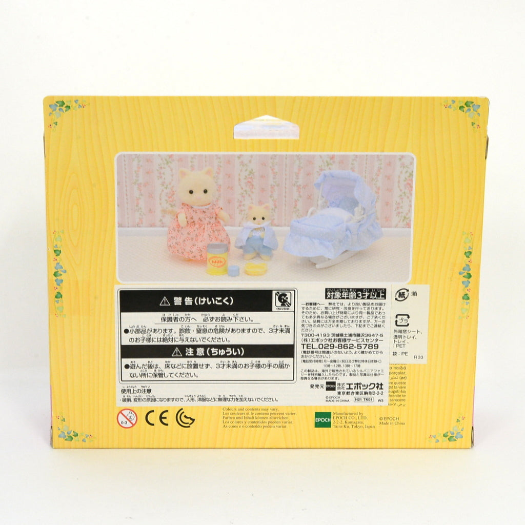 يحتوي على قطة أم كريمية، طفل، مهد الطفل وعناصر متعلقة بالطفل.
