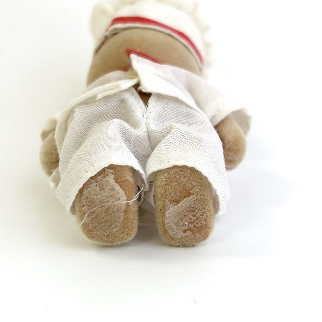 Used. The uniform is discolored, and the bear also shows signs of wear. There are marks on the bottoms of the feet where it was previously glued in place. Please refer to the photo. No box.