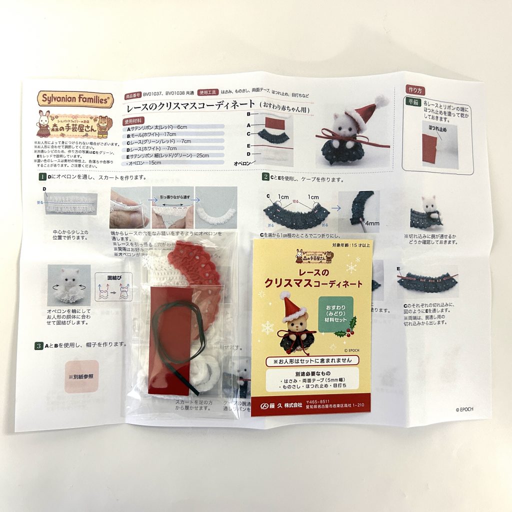 This is a kit to create a lace christmas outfit. The doll is not included in the set. Crafting tools are required separately.