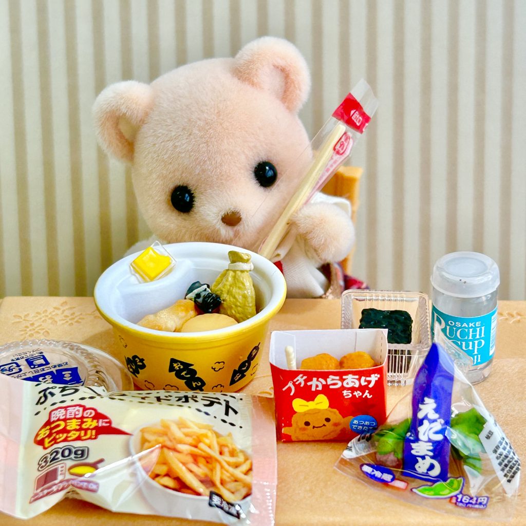 A Re-Ment miniature set themed ”Convenience Store x Evening Drinks” featuring unique items like edamame in a tetra-pack bag and oden, packed with convenience store favorites! Dolls are not included.