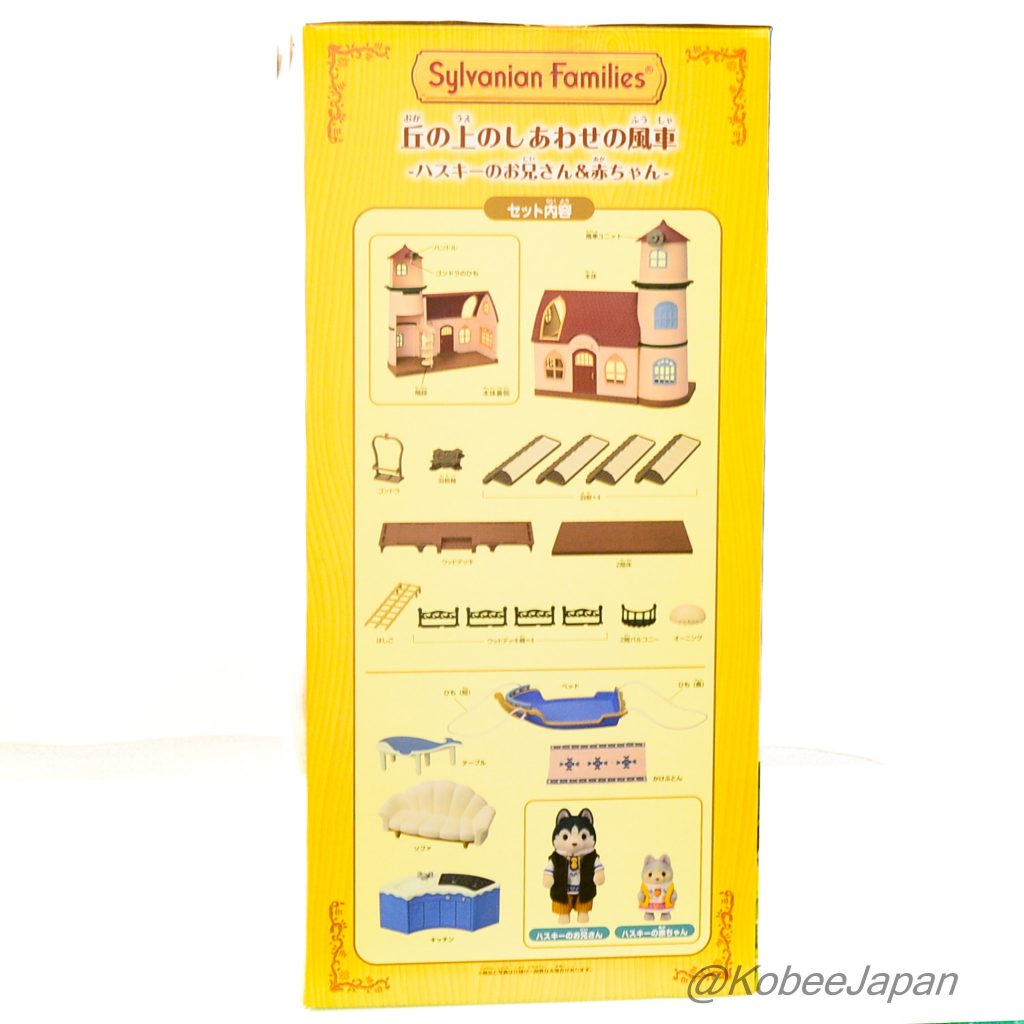 Il s'agit d'un cottage moulin à vent avec un toit rouge distinctif et de grandes ailes. Il dispose d'une gondole pouvant transporter un bébé de haut en bas lorsque le moulin tourne. Le cottage comprend un grand frère husky et un bébé husky en tenues personnalisées, ainsi que du mobilier au design original inspiré de la mer.