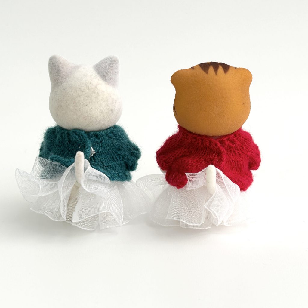 This is a set of two child-sized Aran-pattern sweaters and two skirts. Dolls not included.