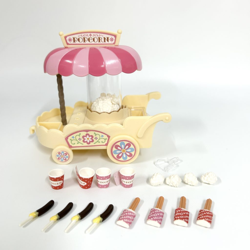 The set includes Shop itself, Signboard, Connecting parts, Scoop x1 / Popcorn, Chocolate banana, Churros x4. You can play by connecting it to an ice cream wagon which is sold saparately. Dolls are not included.