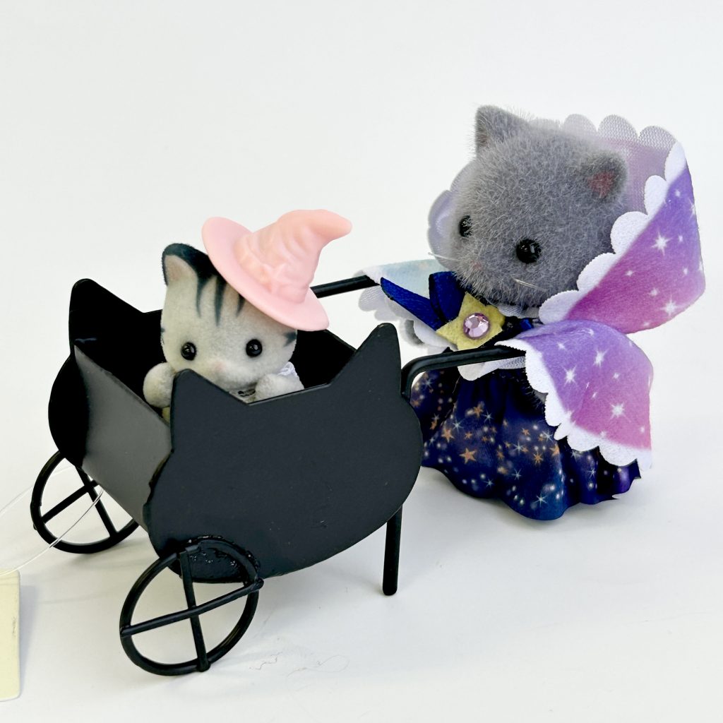 A charming tin cart in the shape of a black cat – fun to push or ride on. Dolls are not included.